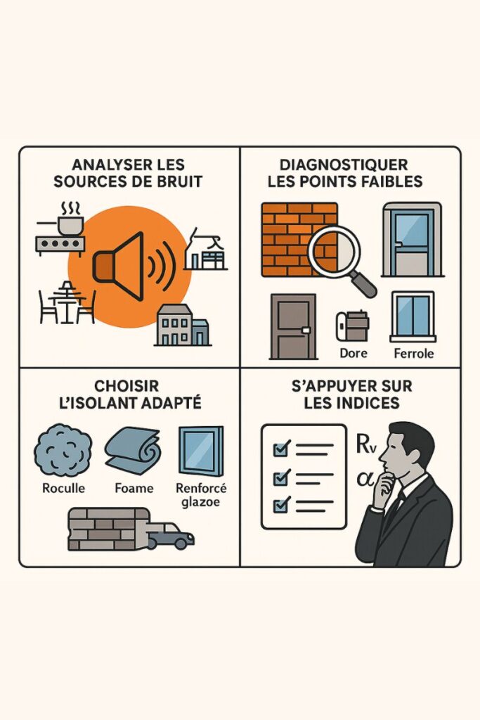 • 📈 Normes et indices techniques : on utilise notamment l’indice d’affaiblissement Rw (en dB) pour l’isolation et le coefficient d’absorption α (0 à 1) pour évaluer l’efficacité des matériaux absorbants.
